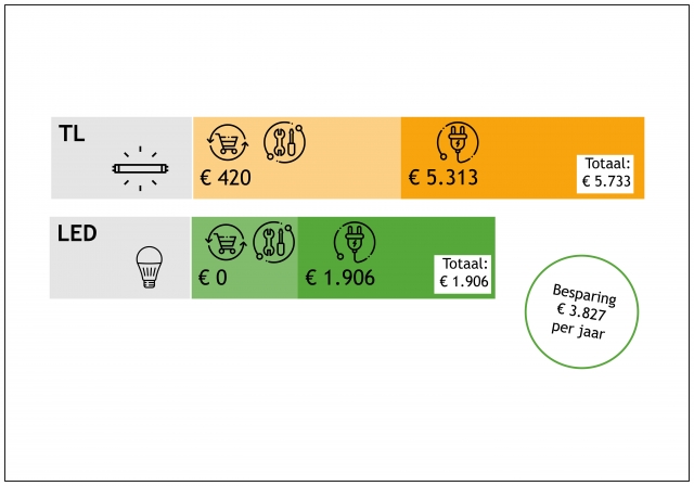 - € 3.827 op aanschaf van nieuwe lichtbronnen, onderhoud en energieverbruik.