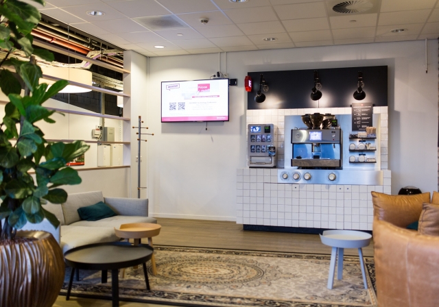 Door het pand heen heeft Mansveld informatie schermen geplaatst die de medewerkers op de hoogte houden van belangrijke evenementen.