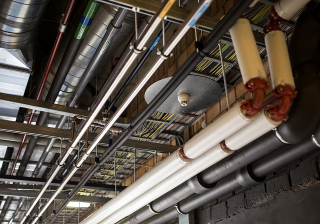 Door de gangen van het pand zijn in een aantal gangen de bekabeling en buizen zichtbaar in het dak. Om ook deze ruimtes te kunnen beveiligen met rookmelders, zijn er kappen gemonteerd boven de melders, zodat in een geval van rookvorming de rook gedetecteerd kan worden.